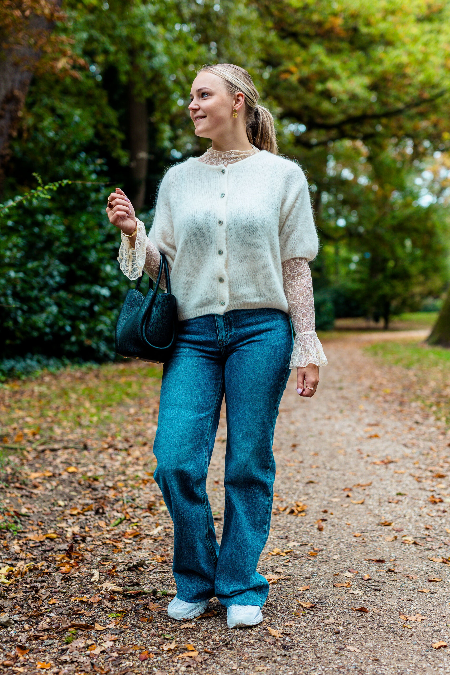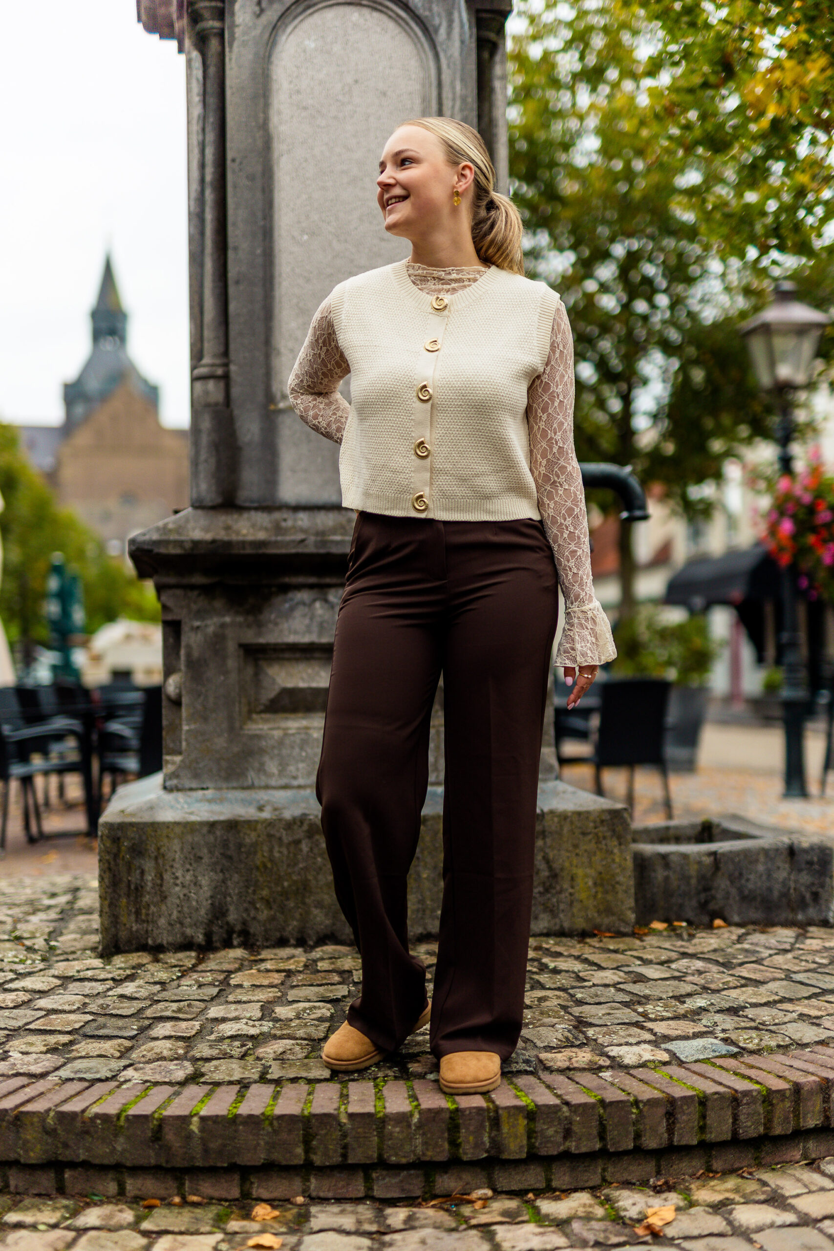 De perfecte beige kanten top. Mega stretchy & eindeloos te combineren. Leuk te dragen met alleen een bh er onder en hoe leuk is deze top onder een jasje met die prachtige mouw.